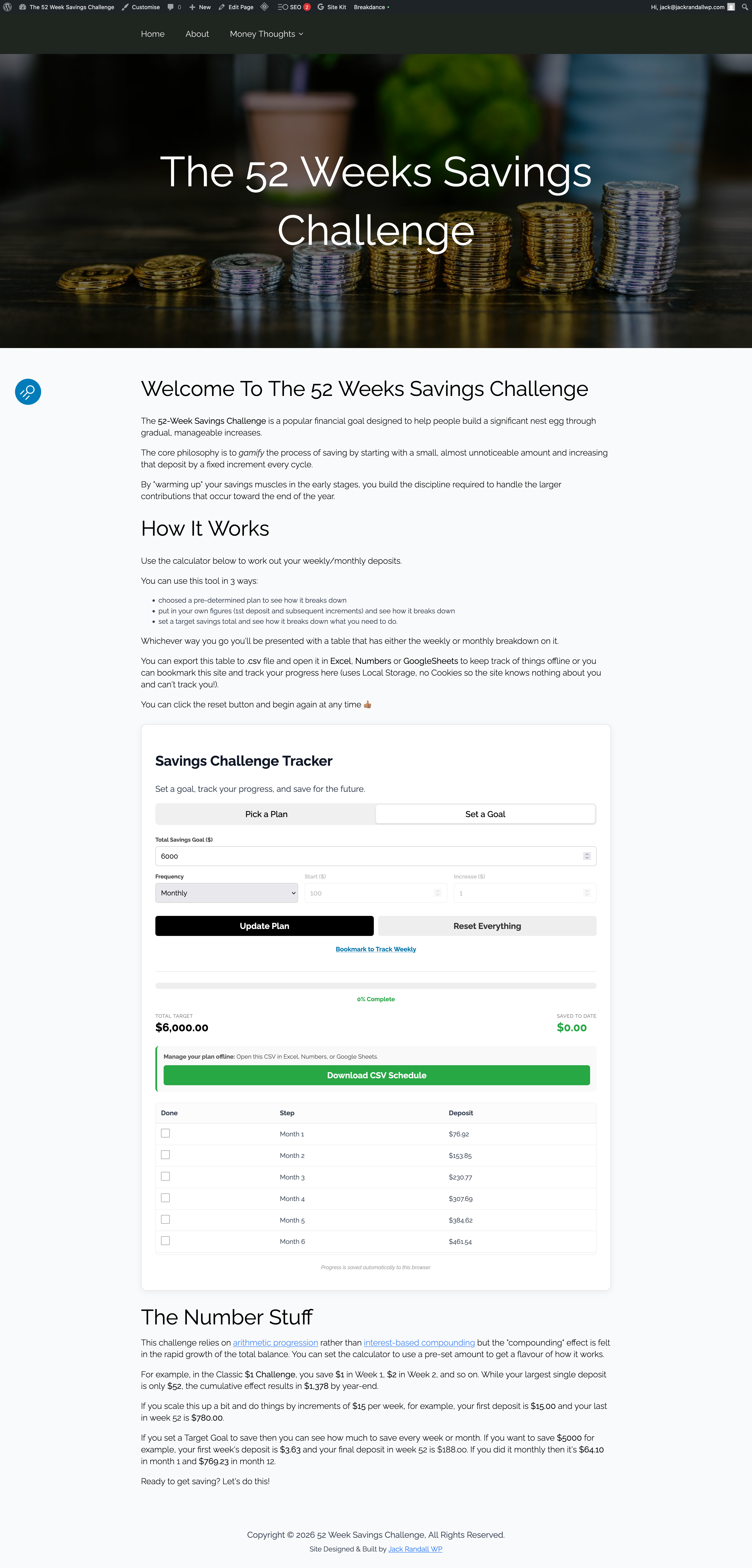 I built a Tool that users can use to create a 52 Week Savings Challenge Plan. You tell it how much you want to start with, how often you want to add to the pile and by how much you want each deposit to go up and it does the rest.
